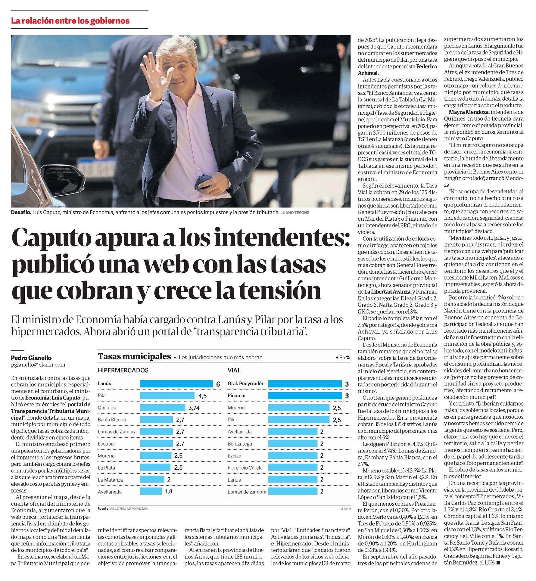 CLARÍN – Caputo apura a los intendentes: publicó una web con las tasas que cobran y crece la tensión