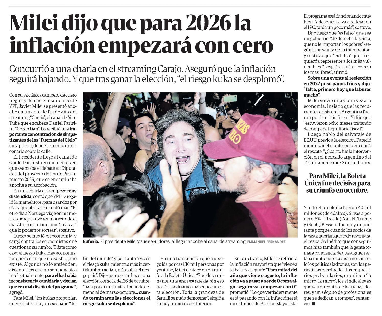 CLARÍN – Milei dijo que para 2026 la inflación empezará con cero
