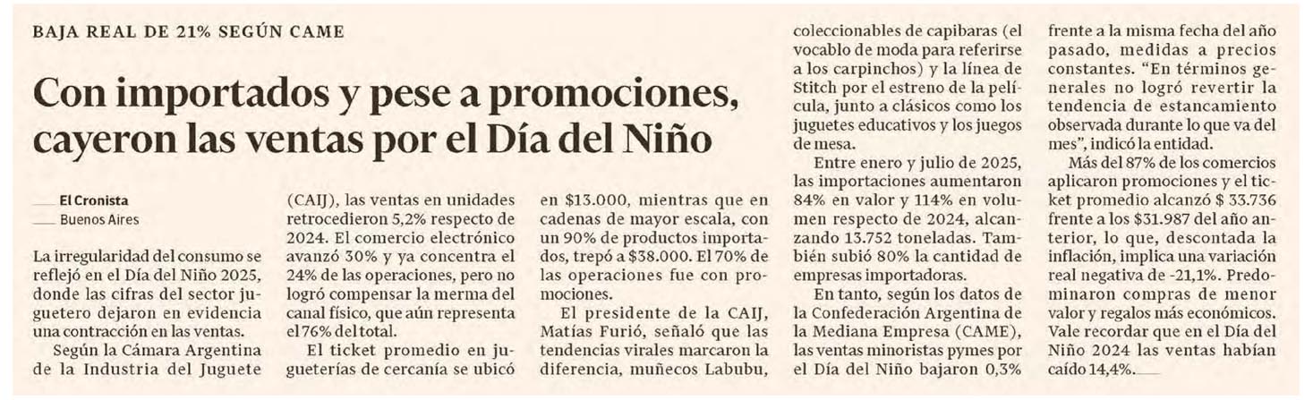 La irregularidad del consumo se reflejo en el Dia del Nino 2025, donde las cifras del sector juguetero dejaron en evidencia una contraccion en las ventas.