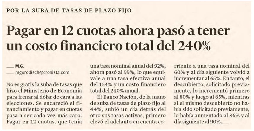 EL CRONISTA – Pagar en 12 cuotas ahora pasó a tener un costo financiero total del 240%