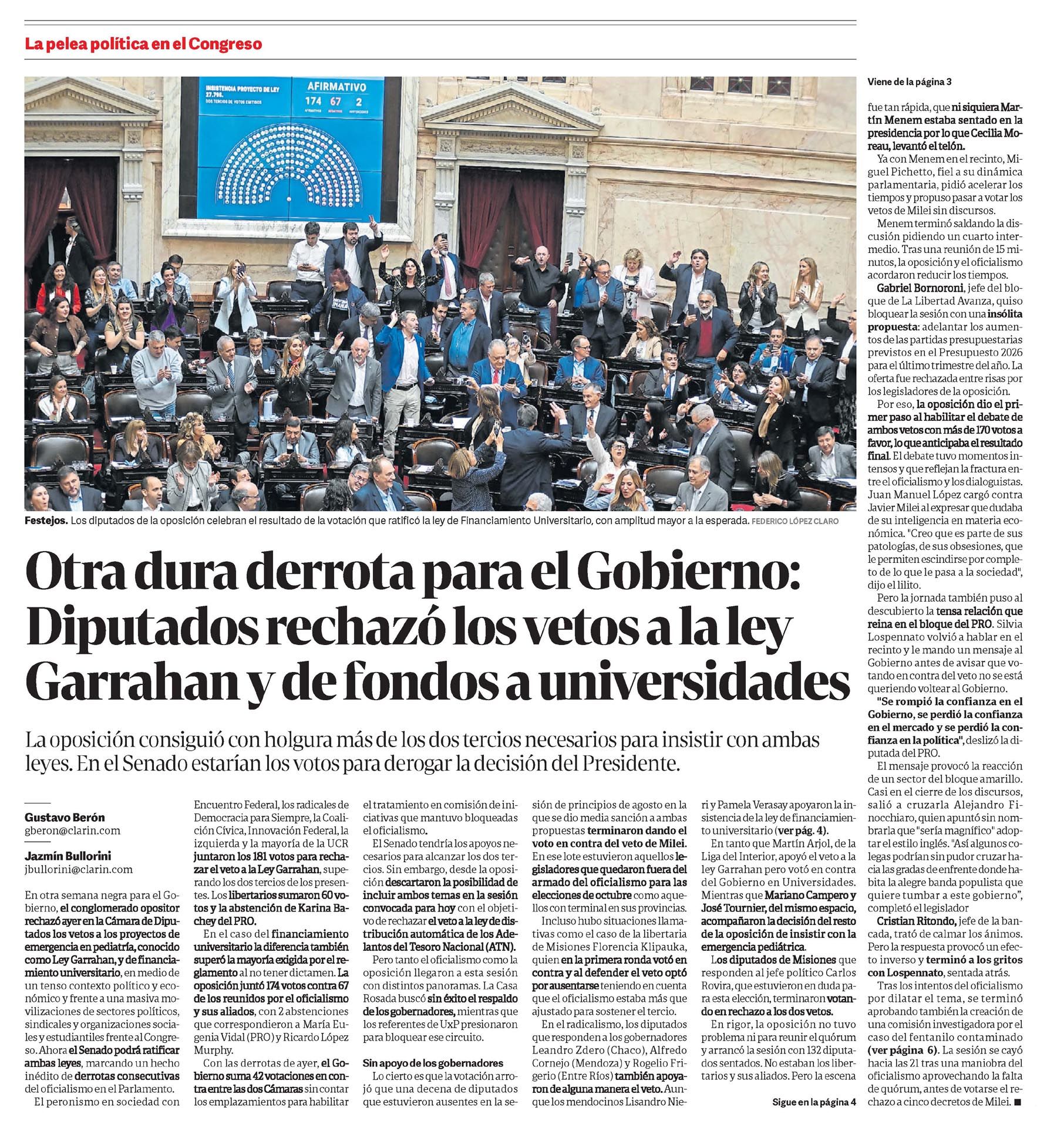 En otra semana negra para el Gobierno, el conglomerado opositor rechazó ayer en la Cámara de Diputados los vetos a los proyectos de emergencia en pediatría, conocido como Ley Garrahan, y de financiamiento universitario, en medio de un tenso contexto político y económico y frente a una masiva movilización de sectores políticos, sindicales y organizaciones sociales y estudiantiles frente al Congreso. Ahora el Senado podrá ratificar ambas leyes, marcando un hecho inédito de derrotas consecutivas del oficialismo en el Parlamento.