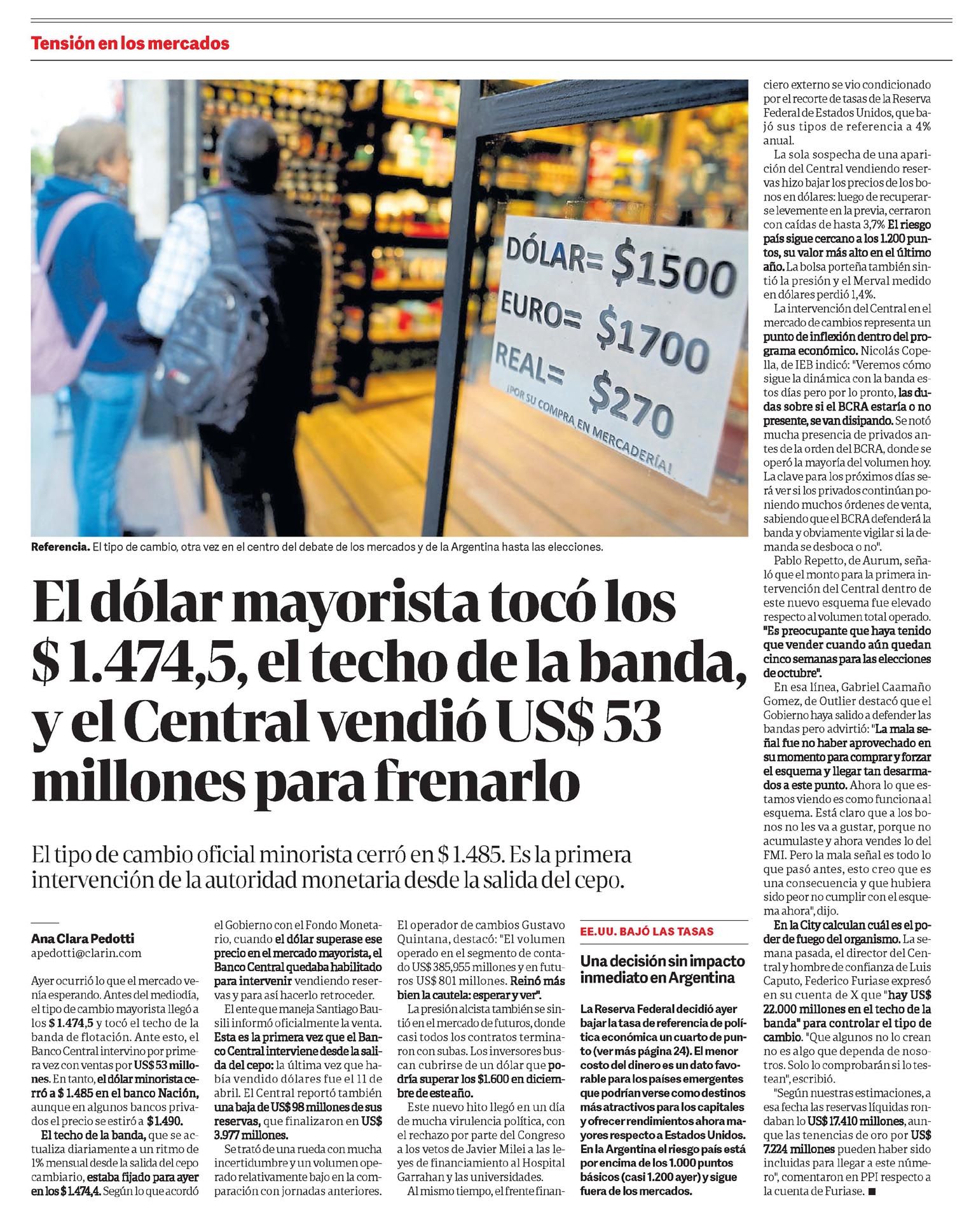CLARÍN – El dólar mayorista tocó los $1.474,5, el techo de la banda, y el Central vendió US$ 53 millones para frenarlo