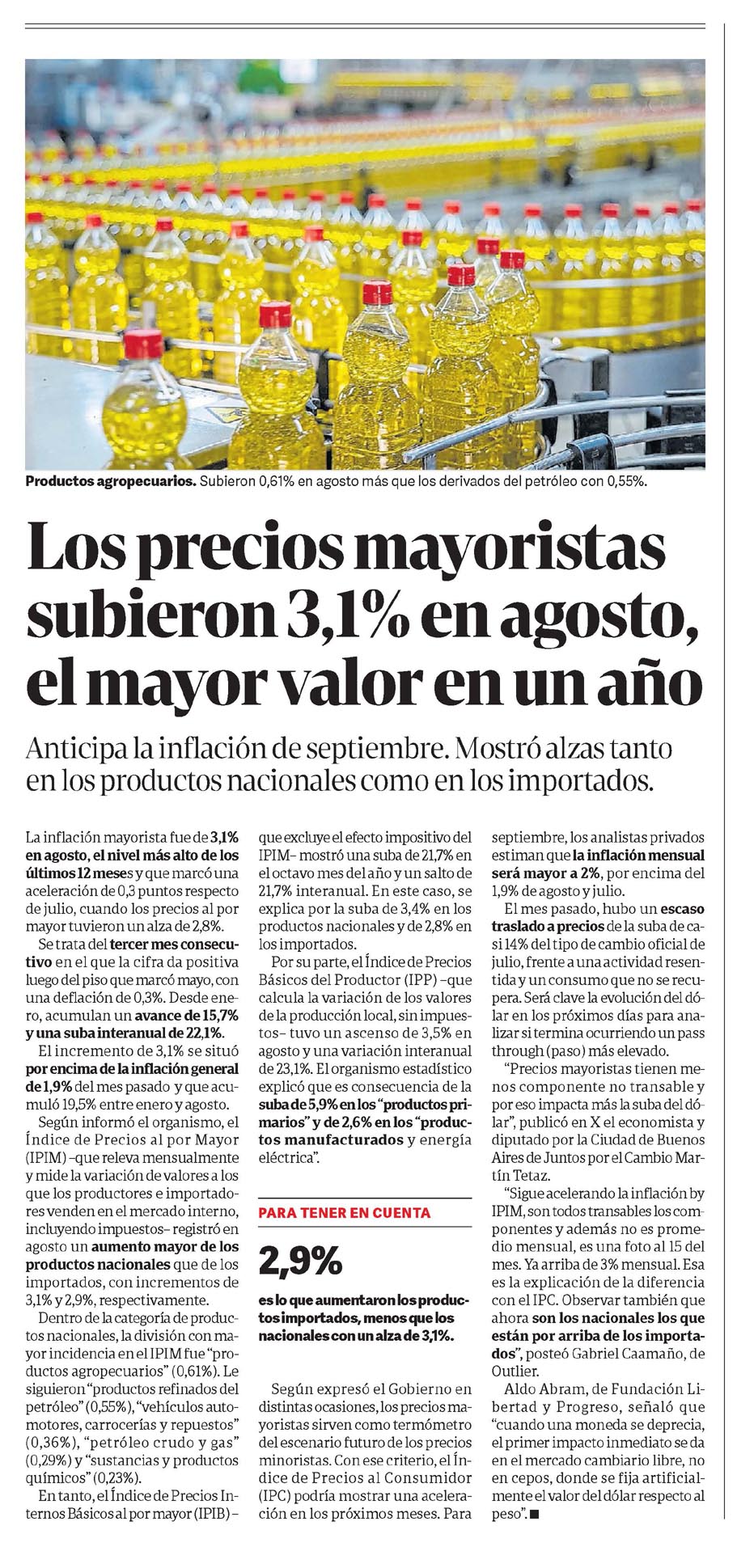 CLARÍN – Los precios mayoristas subieron 3,1% en agosto, el mayor valor en un año