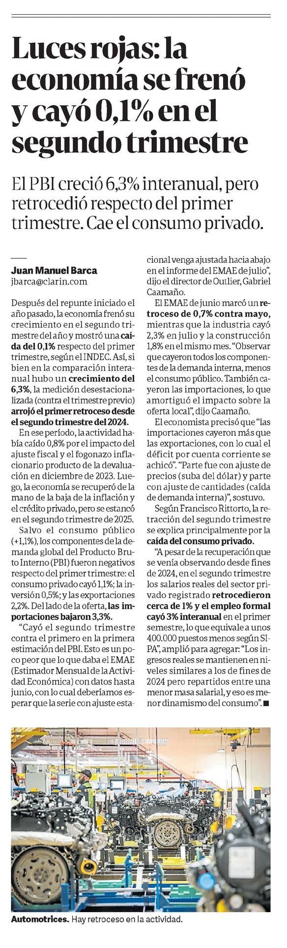 CLARÍN – Luces rojas: la economía se frenó y cayó 0,1% en el segundo trimestre