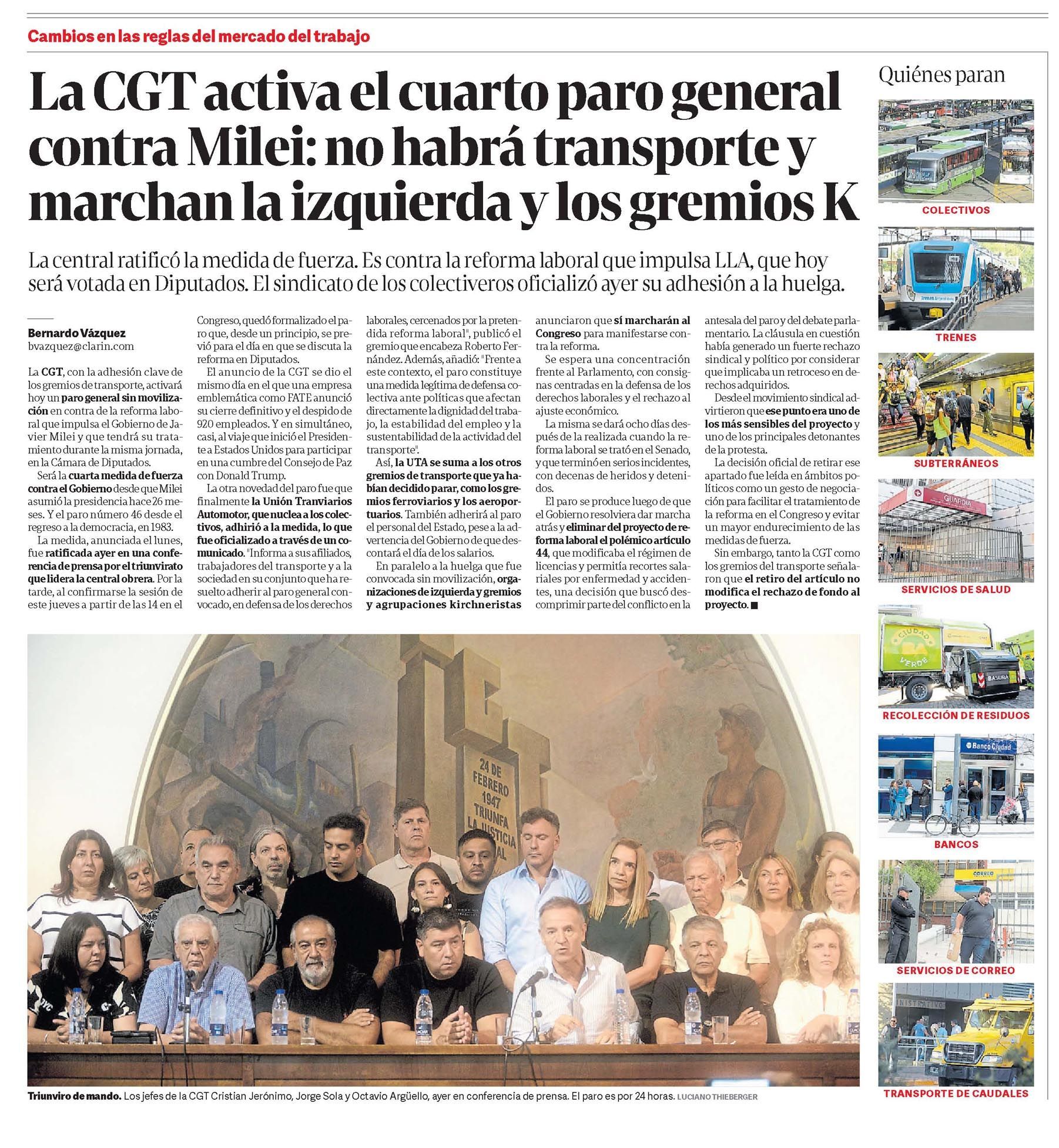 La central ratificó la medida de fuerza. Es contra la reforma laboral que impulsa LLA, que hoy será votada en Diputados. El sindicato de los colectiveros oficializó ayer su adhesión a la huelga