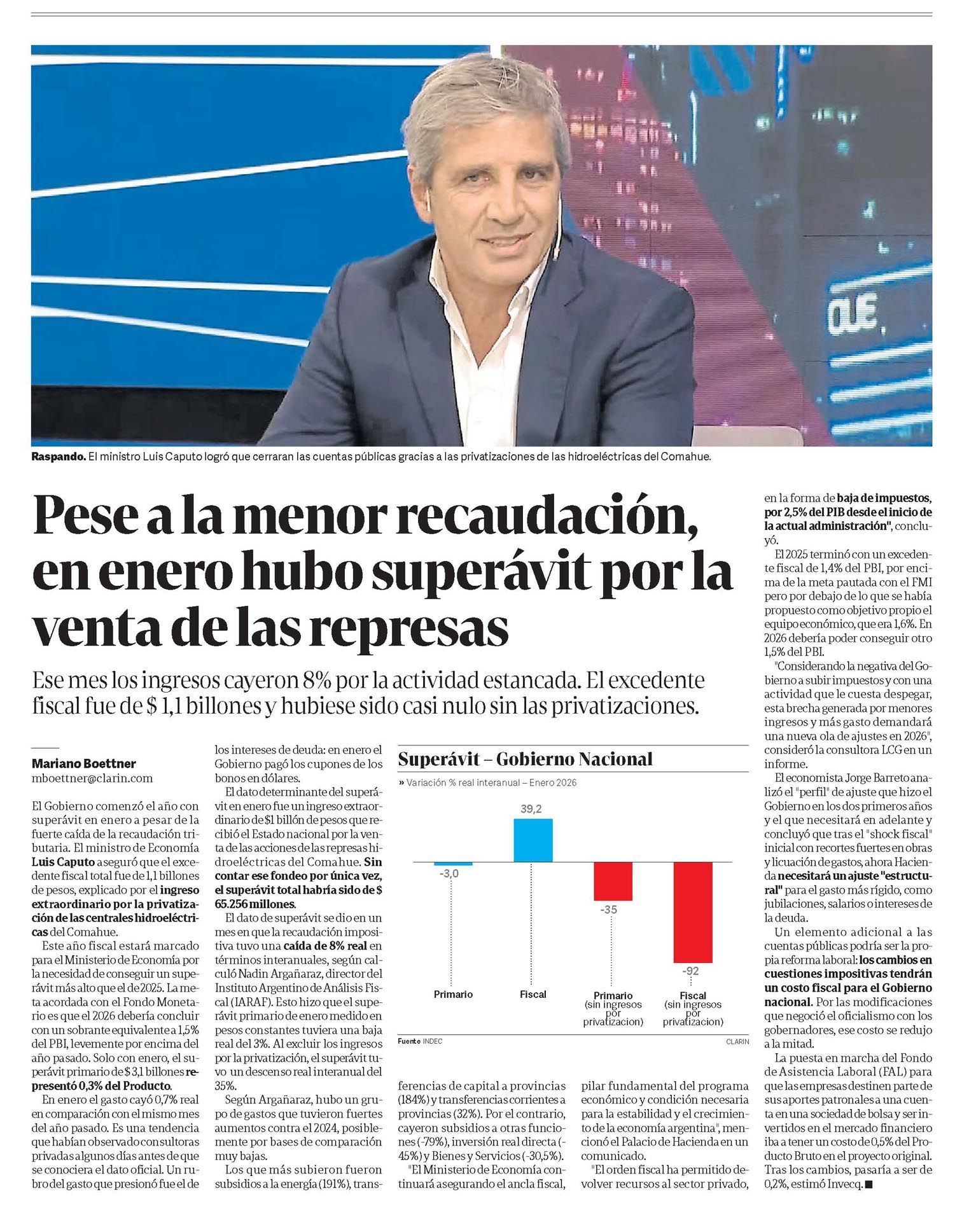 El ministro Luis Caputo logró que cerraran las cuentas públicas gracias a las privatizaciones de las hidroeléctricas del Comahue. Pese a la menor recaudación, en enero hubo superávit por la venta de las represas. Ese mes los ingresos cayeron 8% por la actividad estancada. El excedente fiscal fue de $ 1,1 billones y hubiese sido casi nulo sin las privatizaciones.