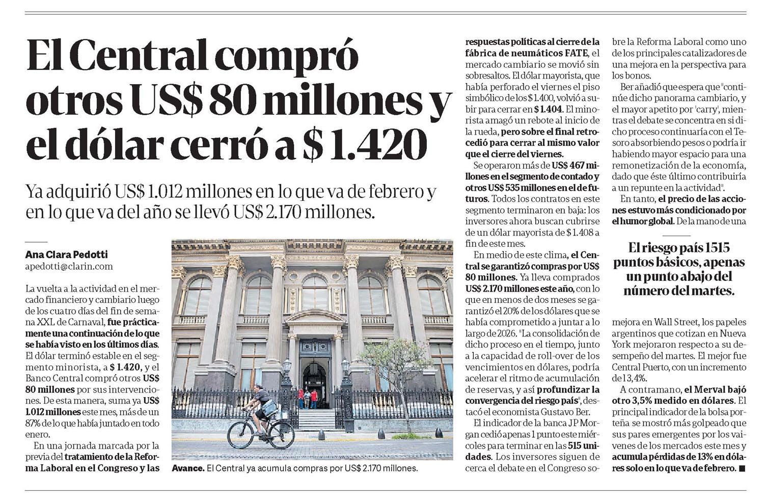 El Central compró otros US$ 80 millones y el dólar cerró a $ 1.420. Ya adquirió US$ 1.012 millones en lo que va de febrero y en lo que va del año se llevó US$ 2.170 millones.