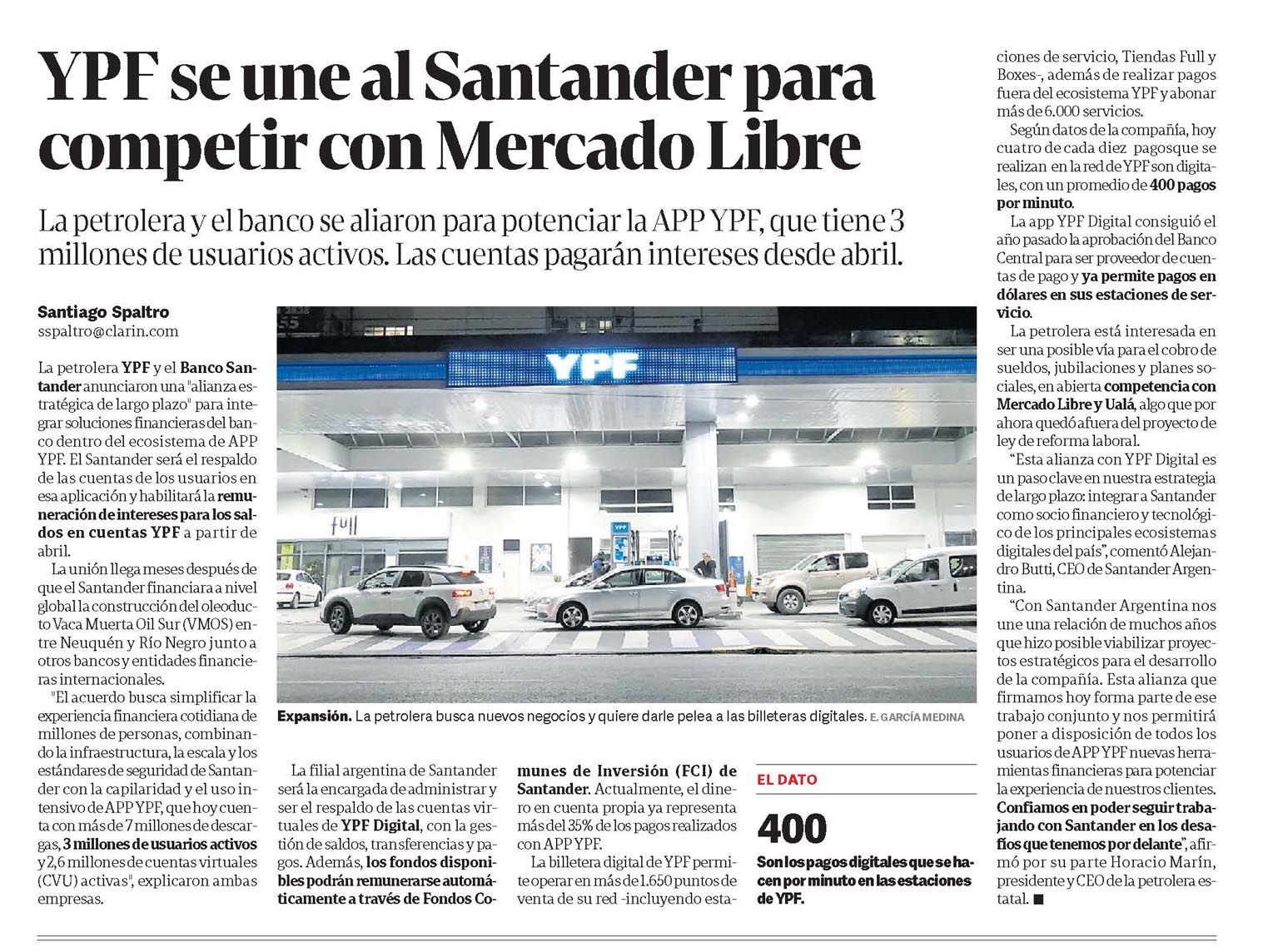CLARÍN – YPF se une al Santander para competir con Mercado Libre