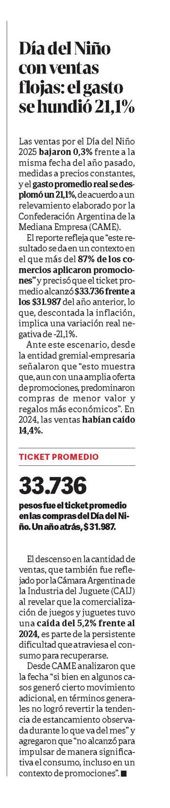 Las ventas por el Día del Niño 2025 bajaron 0,3% frente a la misma fecha del año pasado, medidas a precios constantes, y el gasto promedio real se desplomó un 21,1%, de acuerdo a un relevamiento elaborado por la Confederación Argentina de la Mediana Empresa (CAME)
