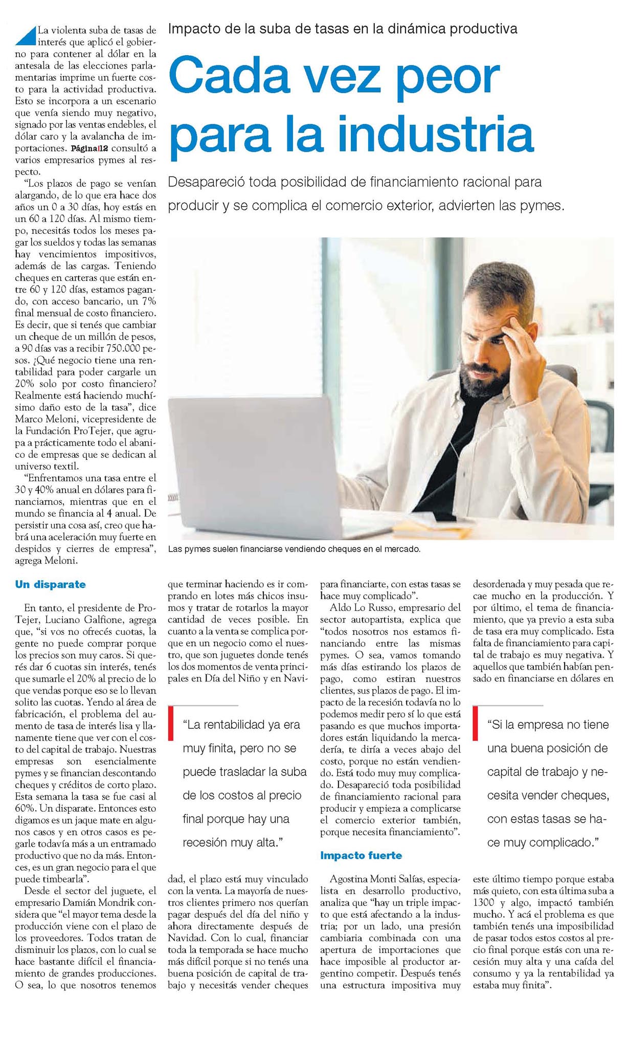 La violenta suba de tasas de interés que aplicó el gobierno para contener al dólar en la antesala de las elecciones parlamentarias imprime un fuerte costo para la actividad productiva.