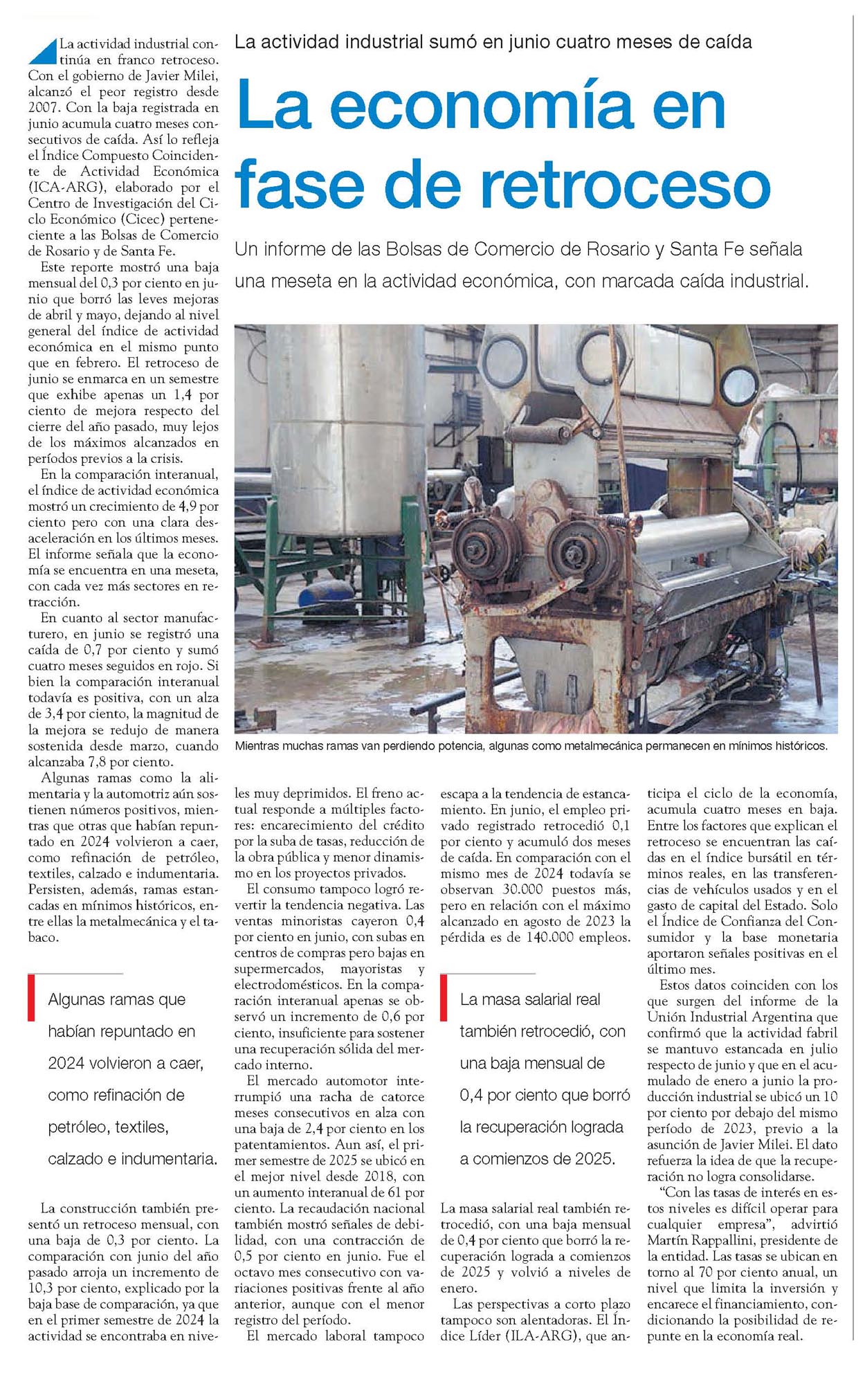 La actividad industrial continúa en franco retroceso. Con el gobierno de Javier Milei, alcanzó el peor registro desde 2007. Con la baja registrada en junio acumula cuatro meses consecutivos de caída. Así lo refleja el Índice Compuesto Coincidente de Actividad Económica (ICA-ARG), elaborado por el Centro de Investigación del Ciclo Económico (Cicec) perteneciente a las Bolsas de Comercio de Rosario y de Santa Fe.