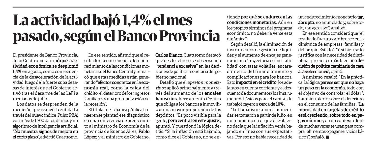 El presidente de Banco Provincia, Juan Cuattromo, afirmó que la actividad económica se desplomó 1,4% en agosto, como consecuencia de la desaceleración de la actividad luego de la fuerte suba de tasas de interés que el Gobierno activó tras el desarme de las LeFibmediados de julio.