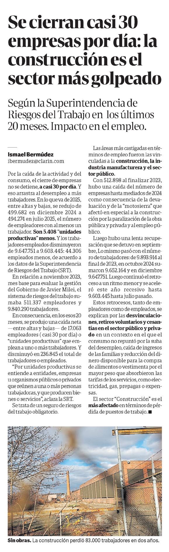 CLARÍN – Se cierran casi 30 empresas por día: la construcción es el sector más golpeado