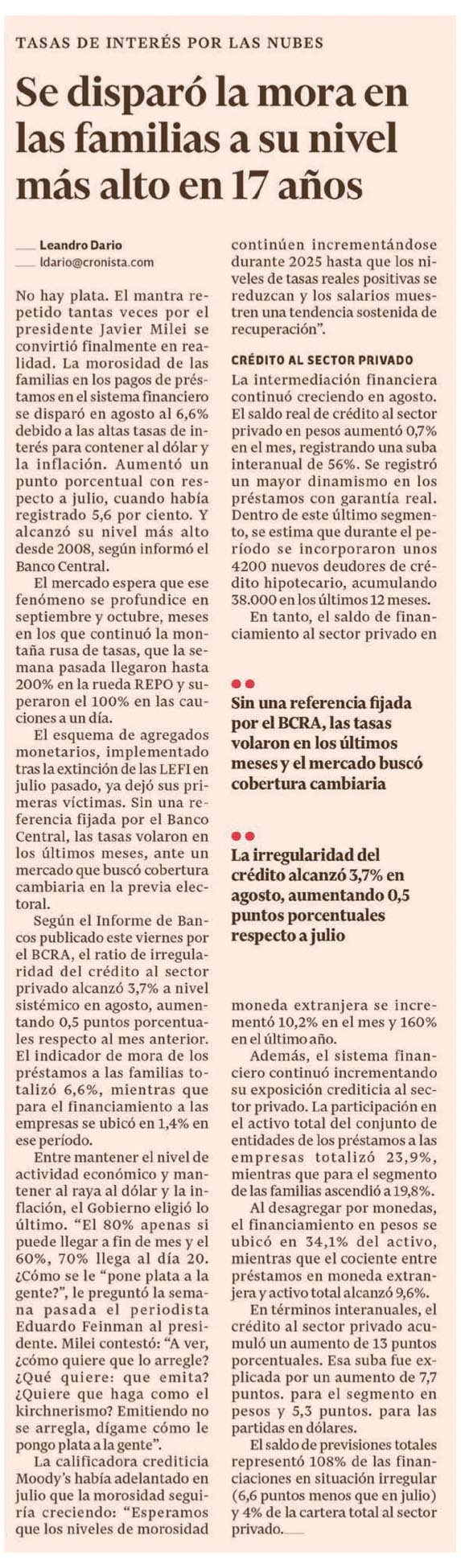No hay plata. El mantra repetido tantas veces por el presidente Javier Milei se convirtió finalmente en realidad. La morosidad de las familias en los pagos de préstamos en el sistema financiero se disparó en agosto al 6,6% debido a las altas tasas de interés para contener al dólar y la inflación. Aumentó un punto porcentual con respecto a julio, cuando había registrado 5,6 por ciento. Y alcanzó su nivel más alto desde 2008, según informó el Banco Central.