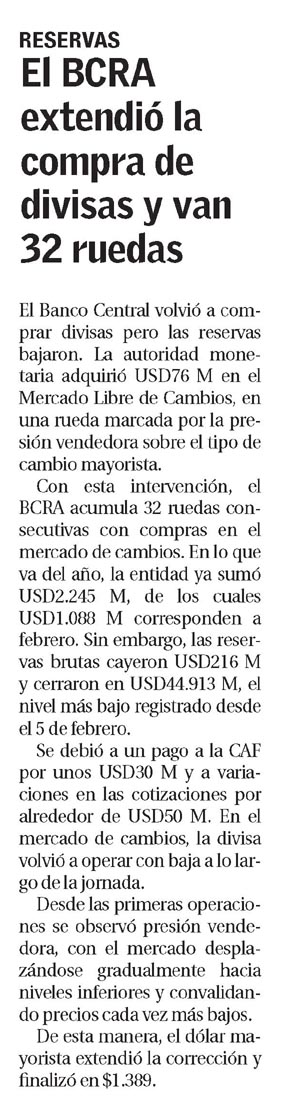 El Banco Central volvió a comprar divisas pero las reservas bajaron. La autoridad monetaria adquirió USD76 M en el Mercado Libre de Cambios, en una rueda marcada por la presión vendedora sobre el tipo de cambio mayorista.