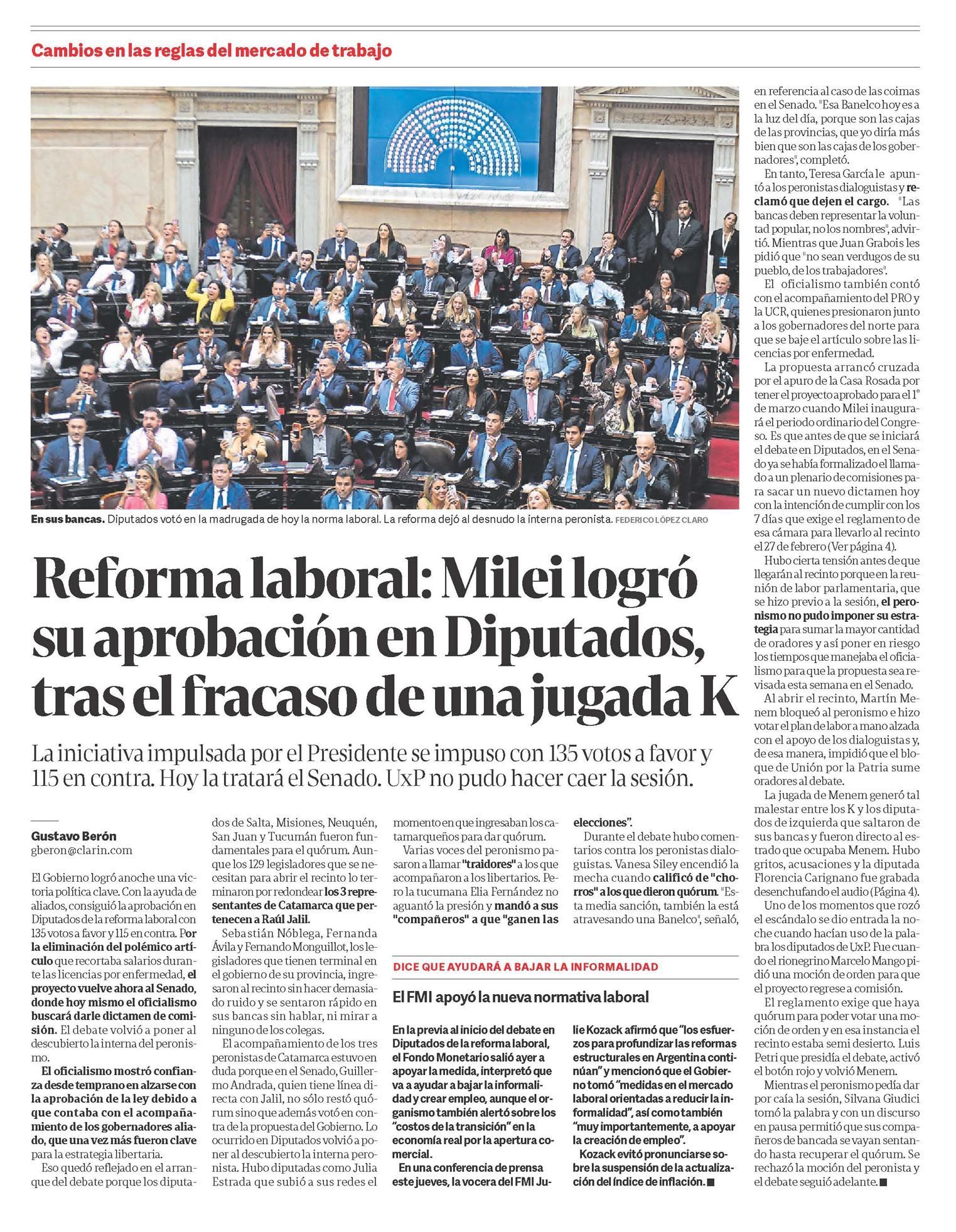CLARÍN – Reforma laboral: Milei logró su aprobación en Diputados, tras el fracaso de una jugada K