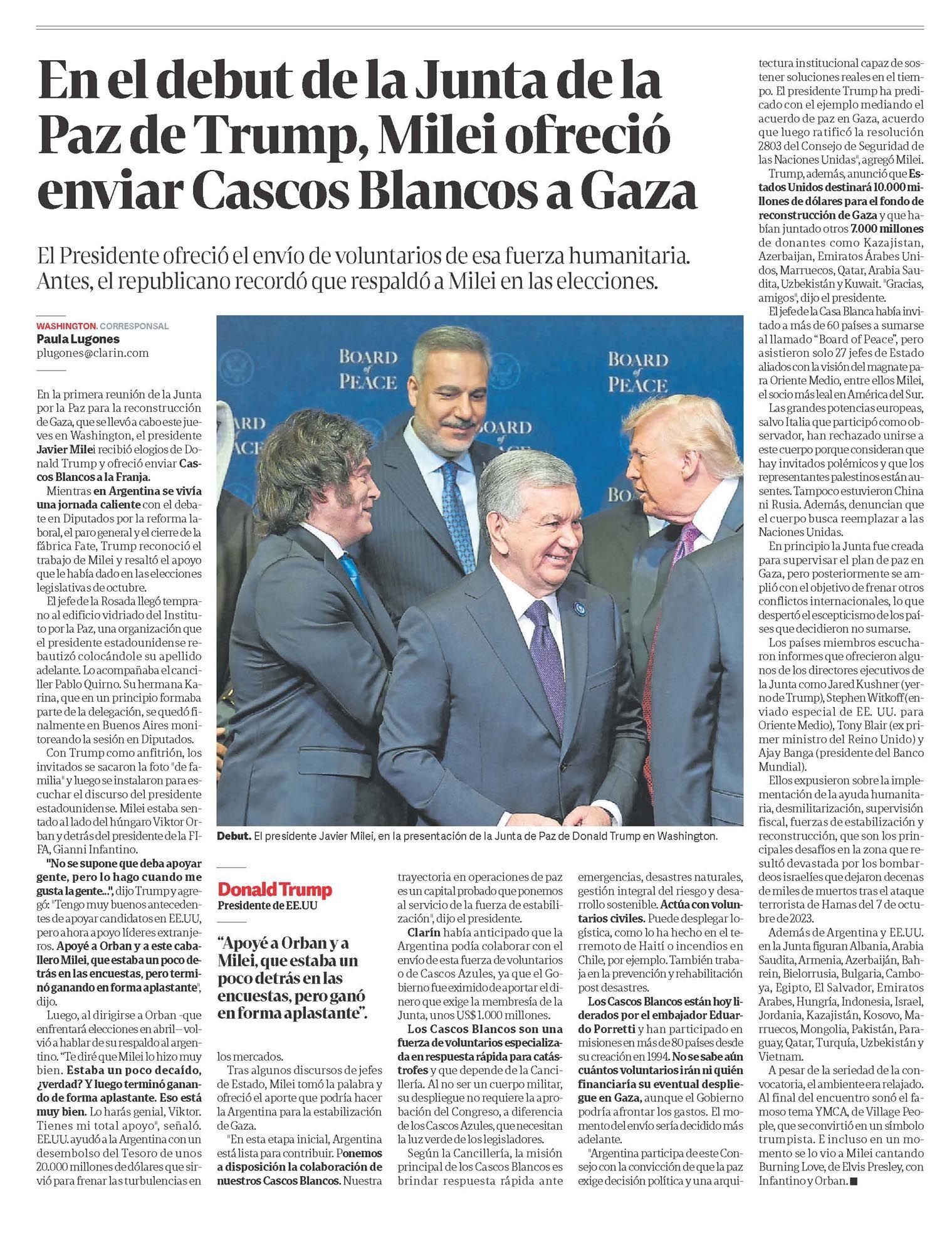 CLARÍN – En el debut de la Junta de la Paz de Trump, Milei ofreció enviar Cascos Blancos a Gaza