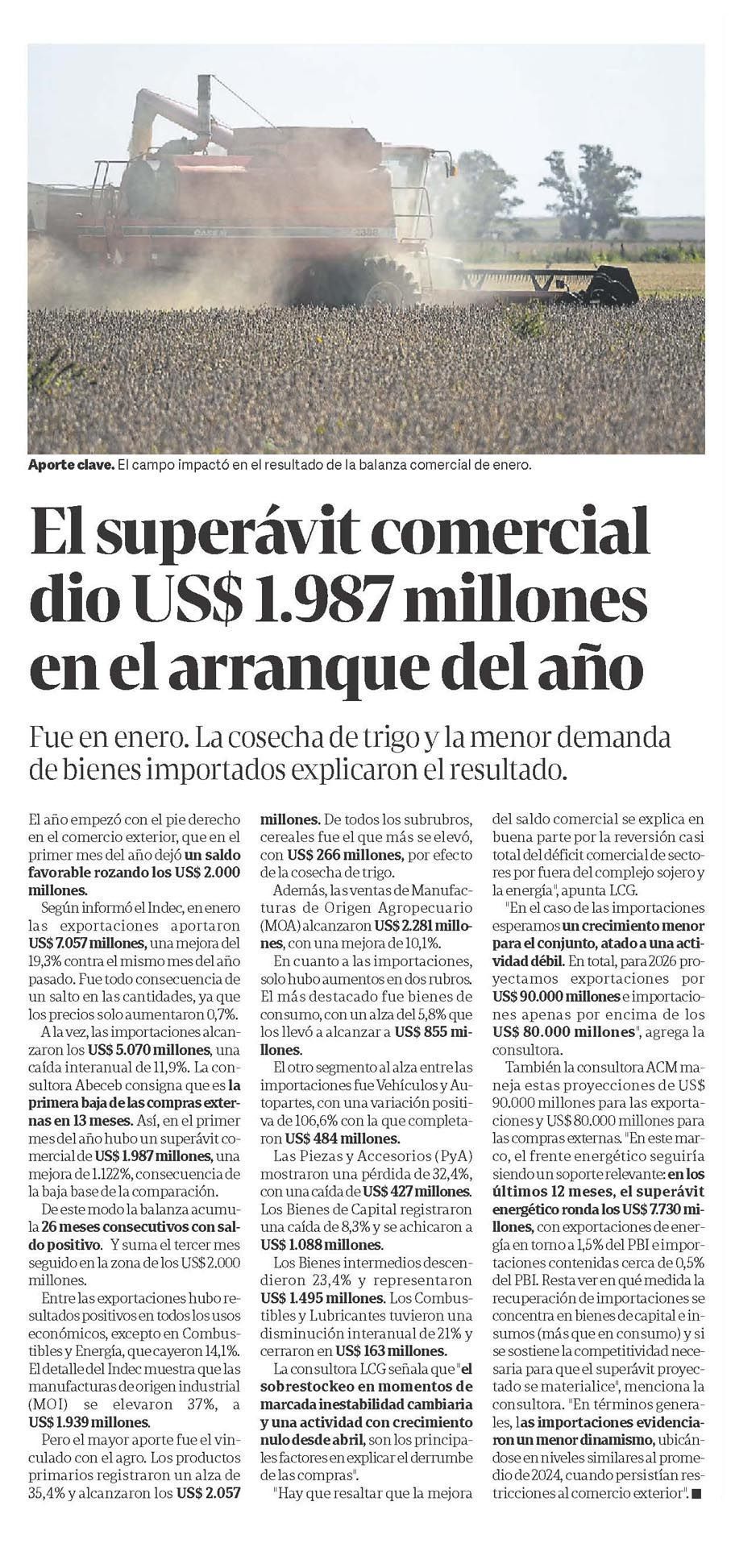 CLARIN – El superávit comercial, US$ 1.987 millones en el arranque del año
