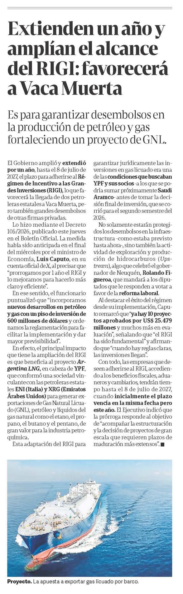 El Gobierno amplió y extendió por un año, hasta el 8 de julio de 2027, el plazo para adherirse al Régimen de Incentivo a las Grandes Inversiones (RIGI), lo que favorecerá la llegada de dos petroleras estatales a Vaca Muerta, pero también grandes desembolsos de otras firmas privadas.