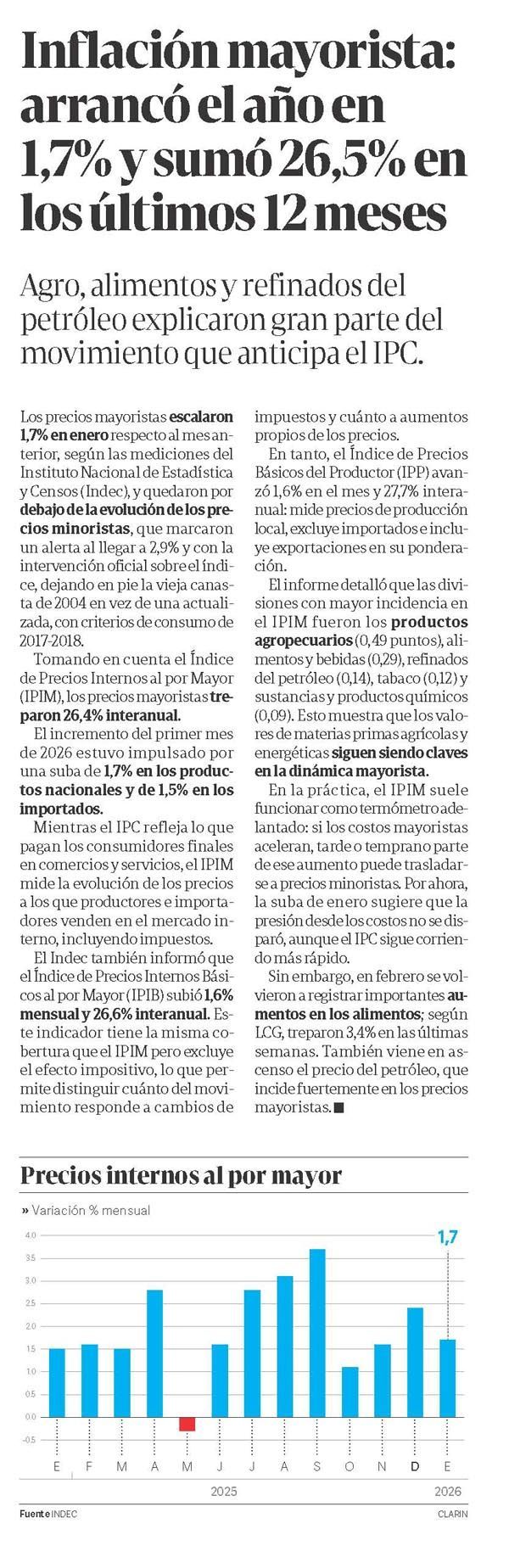 CLARÍN – Inflación mayorista: arrancó el año en 1,7% y sumó 26,5% en los últimos 12 meses
