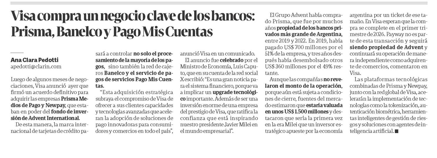 CLARÍN – Visa compra un negocio clave de los bancos: Prisma, Banelco y Pago Mis Cuentas