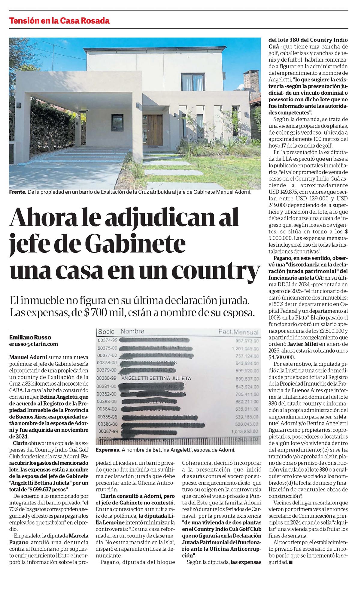 CLARÍN – Ahora le adjudican a jefe de Gabinete una casa en un country