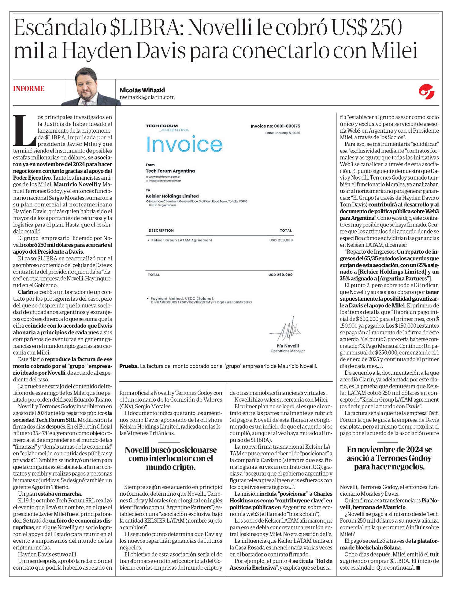 CLARÍN – Escándalo $LIBRA: Novelli le cobró US$ 250 mil a Hayden Davis para conectarlo con Milei