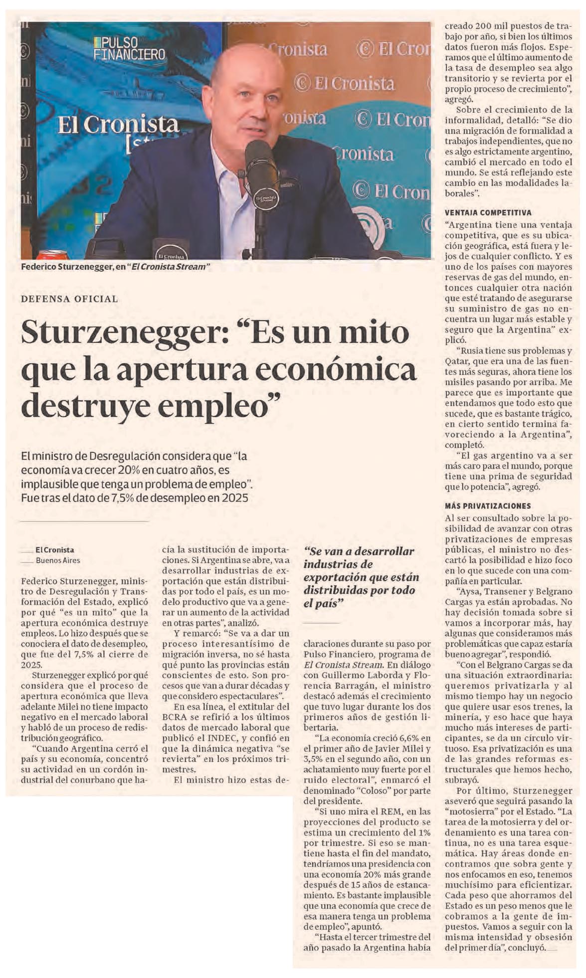EL CRONISTA – Sturzenegger: "Es un mito que la apertura económica destruye empleo"