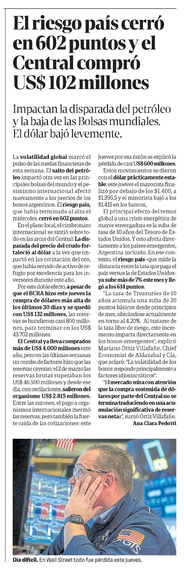 CLARÍN – El riesgo país cerró en 602 puntos y el Central compró US$ 102 millones