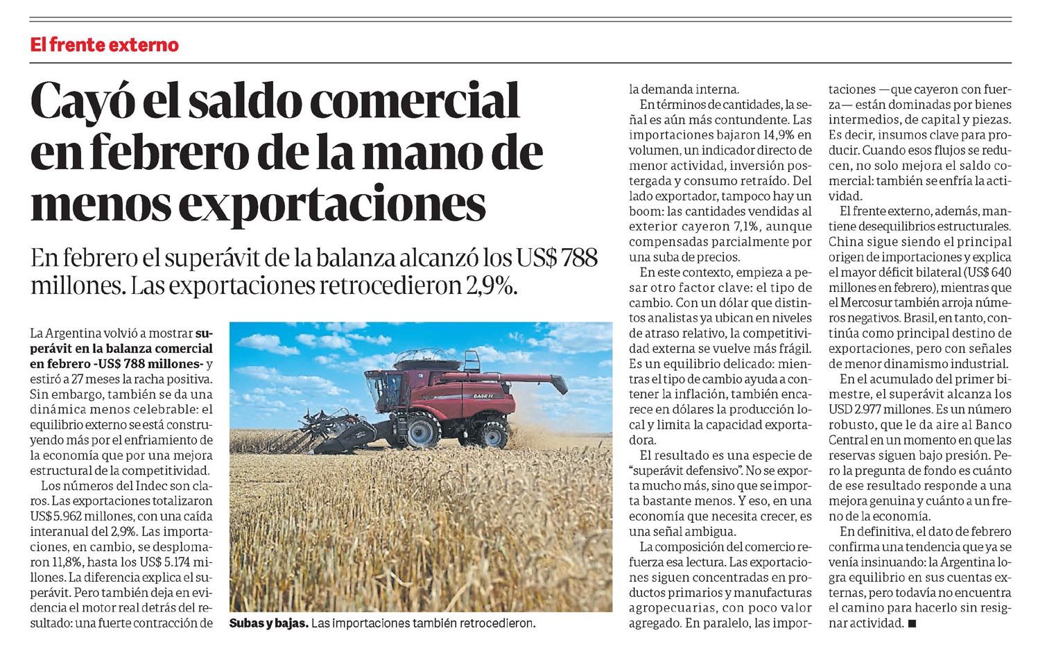 La Argentina volvió a mostrar superávit en la balanza comercial en febrero -US$ 788 millones- y estiró a 27 meses la racha positiva. Sin embargo, también se da una dinámica menos celebrable: el equilibrio externo se está construyendo más por el enfriamiento de la economía que por una mejor estructural de la competitividad.