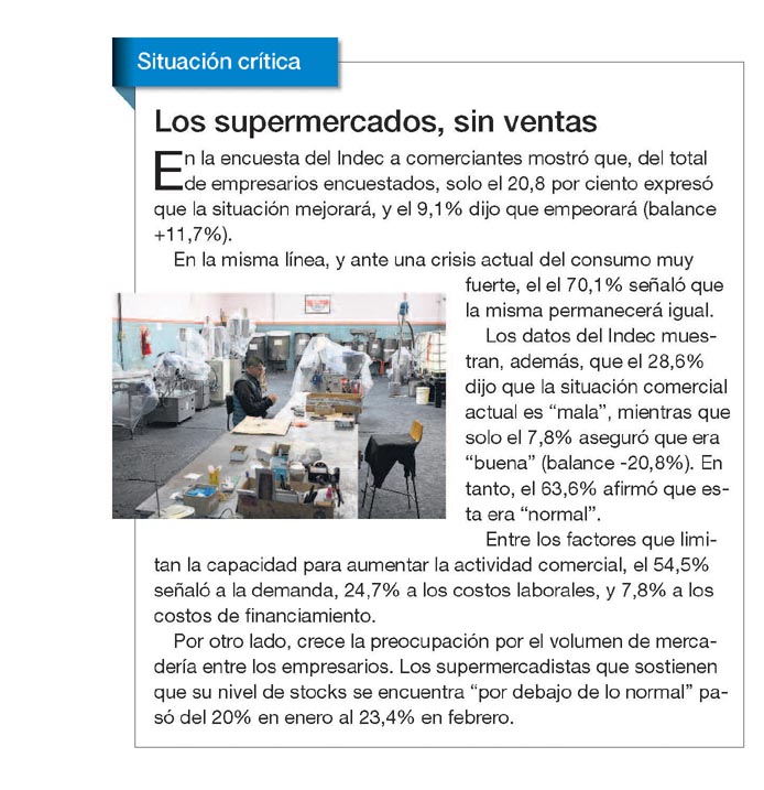 En la encuesta del Indec a comerciantes mostró que, del total de empresarios encuestados, solo el 20,8 por ciento expresó que la situación mejorará, y el 9,1% dijo que empeorará (balance +11,7%). En la misma línea, y ante una crisis actual del consumo muy fuerte, el 70,1% señaló que la misma permanecerá igual.