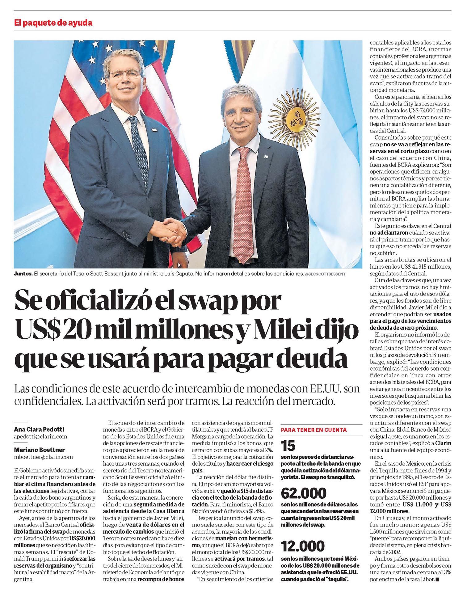 CLARÍN – Se oficializó el swap por US$20 mil millones y Milei dijo que se usará para pagar deuda