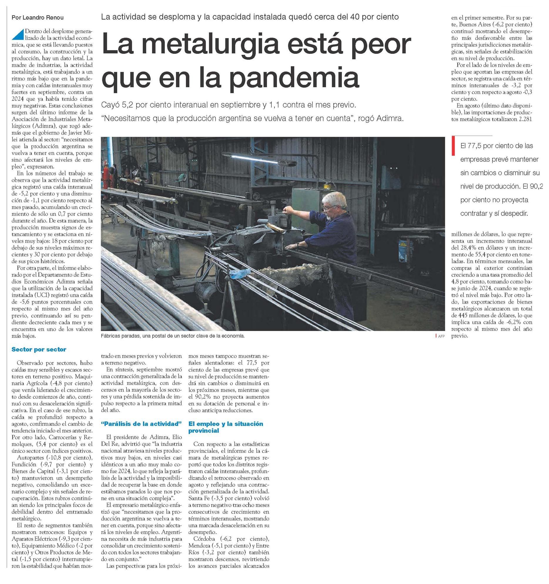 Dentro del desplome generalizado de la actividad económica, que se está llevando puesto el consumo, la construcción y la producción, hay un dato letal. La madre de industrias, la actividad metalúrgica, está trabajando a un ritmo más bajo que en la pandemia y con caídas interanuales muy fuertes en septiembre, contra un 2024 que ya había tenido cifras muy negativas.