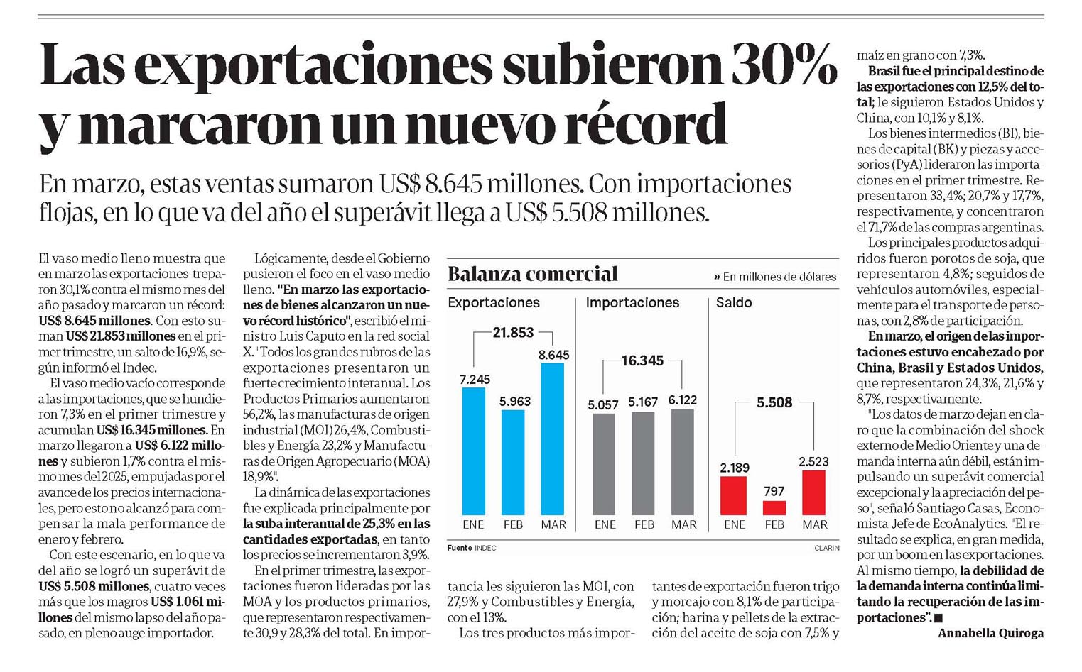CLARÍN – Las exportaciones subieron 30% y marcaron un nuevo récord