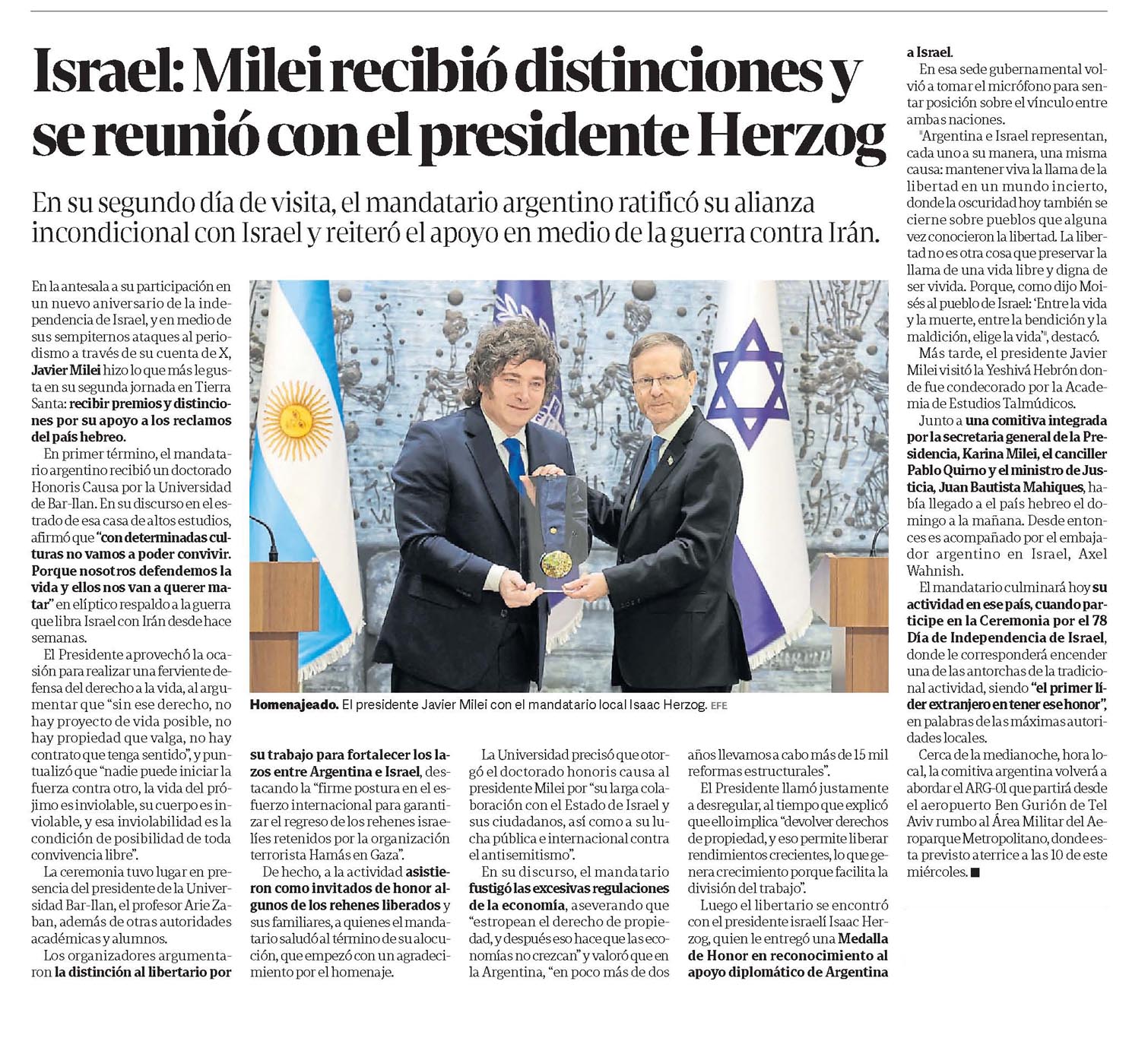CLARÍN – Israel Milei recibió distinciones y se reunió con el presidente Herzog