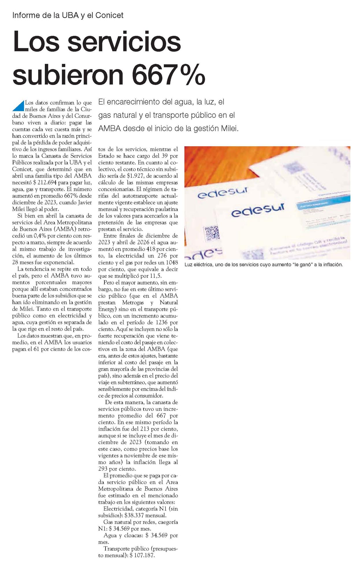 Los datos confirman lo que miles de familias de la Ciudad de Buenos Aires y del Conurbano viven a diario: pagar las cuentas cada vez cuesta más y se han convertido en la razón principal de la pérdida de poder adquisitivo de los ingresos familiares. Así lo marca la Canasta de Servicios Públicos realizada por la UBA y el Conicet, que determinó que en abril una familia tipo del AMBA necesitó $ 212.694 para pagar luz, agua, gas y transporte. El número aumentó en promedio 667% desde diciembre de 2023, cuando Javier Milei llegó al poder.
