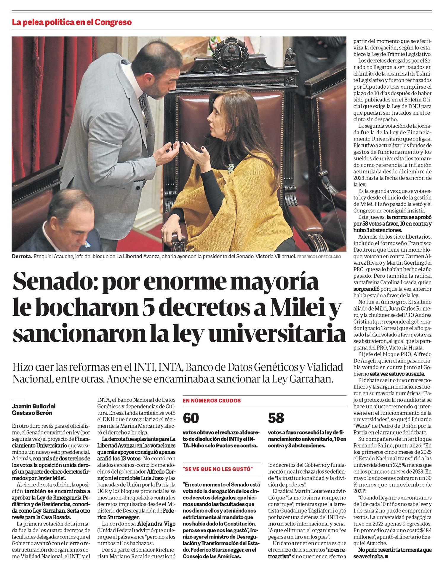 En otro duro revés para el oficialismo, el Senado convirtió en ley (por segunda vez) el proyecto de Financiamiento Universitario que va camino a un nuevo veto presidencial. Además, con más de dos tercios de los votos la oposición unida derogó un paquete de cinco decretos firmados por Javier Milei.