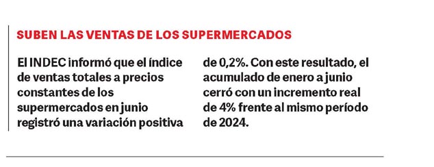 El INDEC informó que el índice de ventas totales a precios constantes de los supermercados en junio registró una variación positiva de 0,2%. Con este resultado, el acumulado de enero a junio cerró con un incremento real de 4% frente al mismo período de 2024.