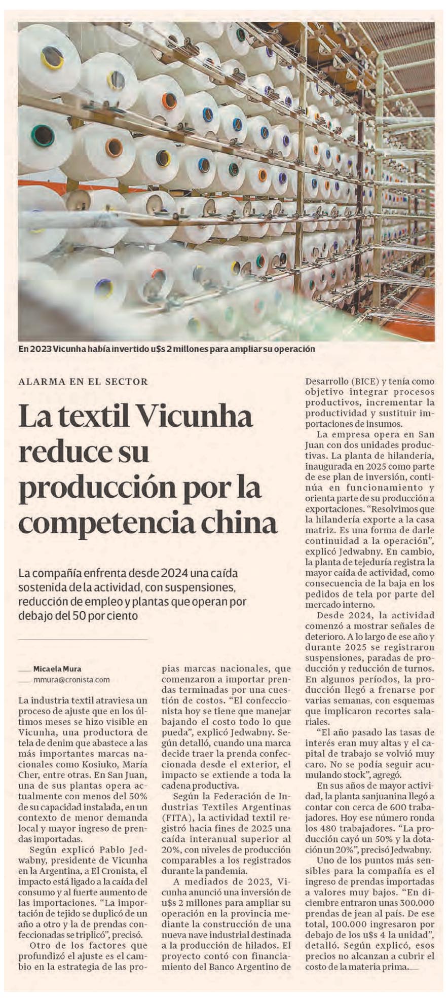 EL CRONISTA – La textil Vicunha reduce su producción por la competencia china