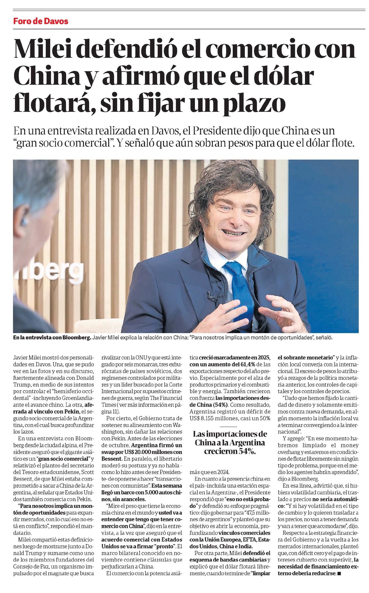 CLARÍN – Milei defendió el comercio con China y afirmó que el dólar flotará, sin fijar un plazo