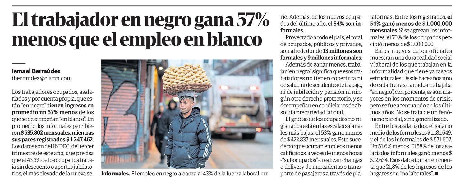 CLARÍN – El trabajador en negro gana 57% menos que el empleo en blanco