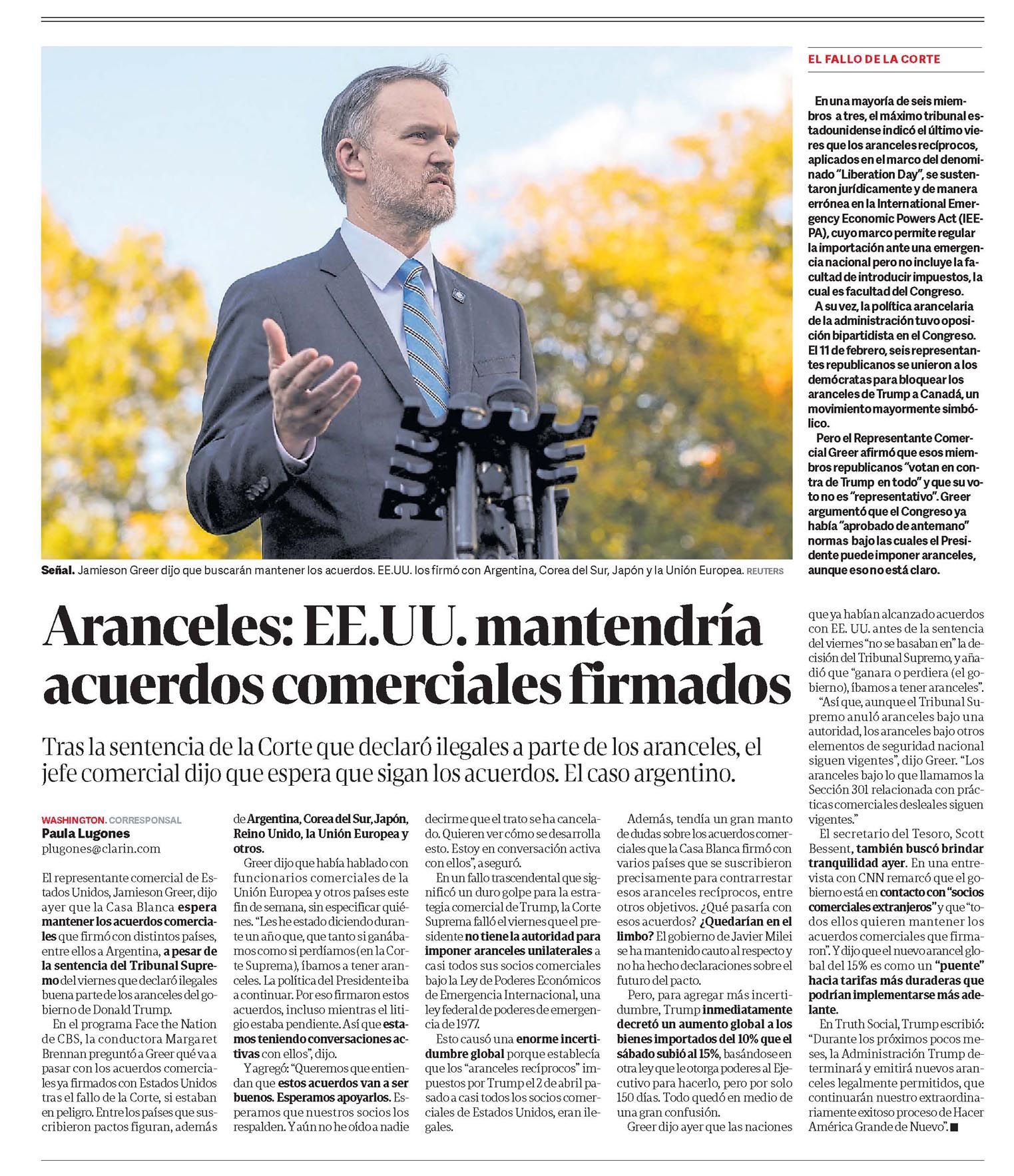 El representante comercial de Estados Unidos, Jamieson Greer, dijo ayer que la Casa Blanca espera mantener los acuerdos comerciales que firmó con distintos países, entre ellos a Argentina, a pesar de la sentencia del Tribunal Supremo del viernes que declaró ilegales buena parte de los aranceles del gobierno de Donald Trump.