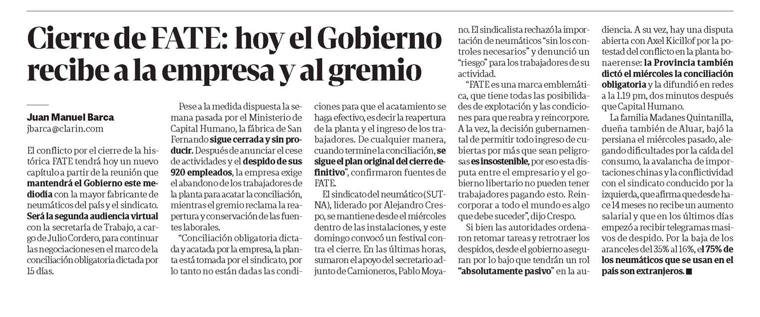 CLARÍN – Cierre de FATE: hoy el Gobierno recibe a la empresa y al gremio