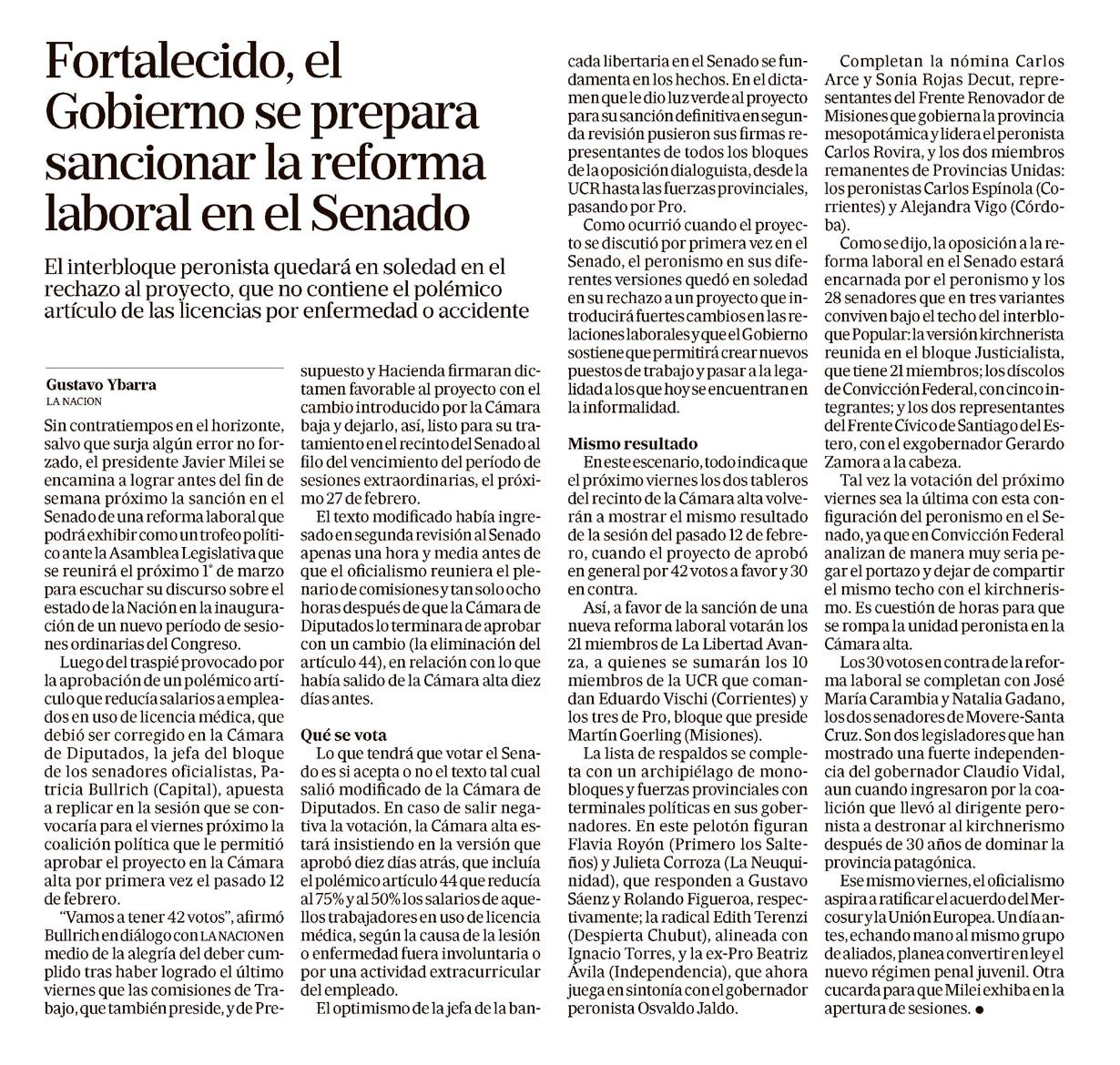 LA NACIÓN –  Fortalecido el Gobierno se prepara a sancionar la reforma laboral en el Senado