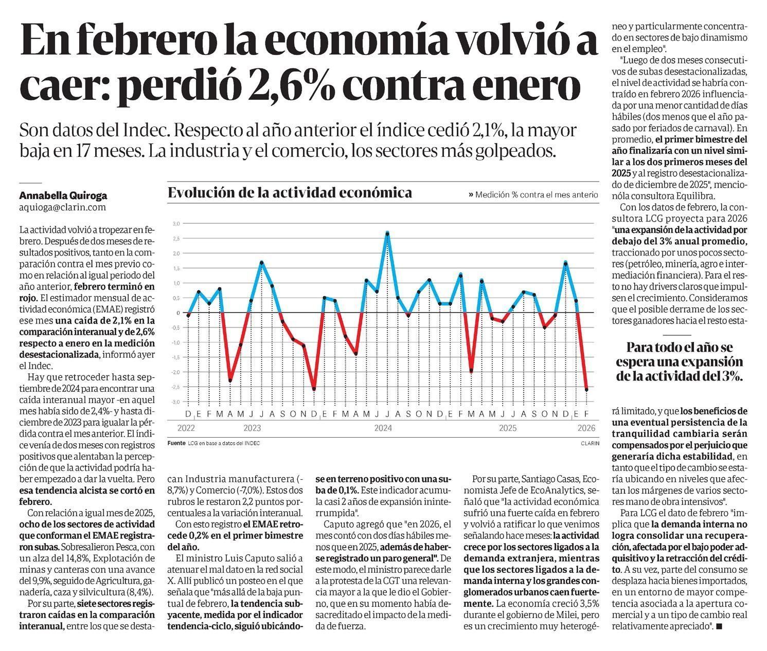 CLARÍN – En febrero la economía volvió a caer: perdió 2,6% contra enero