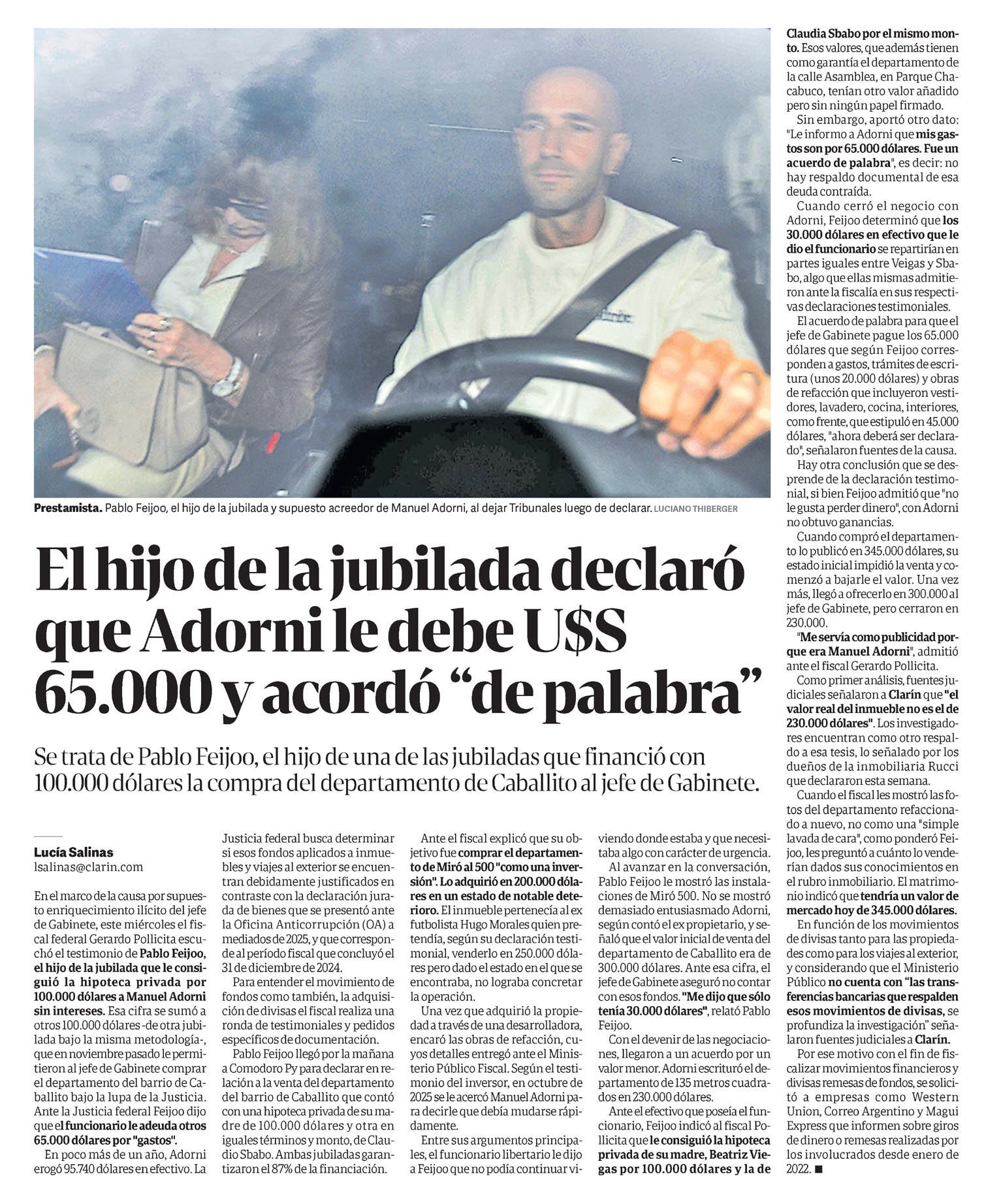 El hijo de la jubilada declaró que Adorni le debe U$S 65.000 y acordó "de palabra" Se trata de Pablo Feijoo, el hijo de una de las jubiladas que financió con 100.000 dólares la compra del departamento de Caballito al jefe de Gabinete.