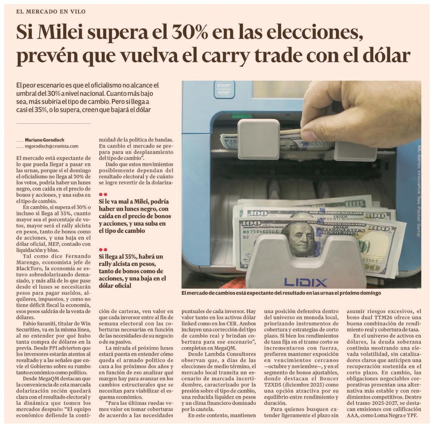 El peor escenario es que el oficialismo no alcance el umbral del 30% a nivel nacional. Cuanto más bajo sea, más subiría el tipo de cambio. Pero si llega a casi el 35%, o lo supera, creen que bajará el dólar