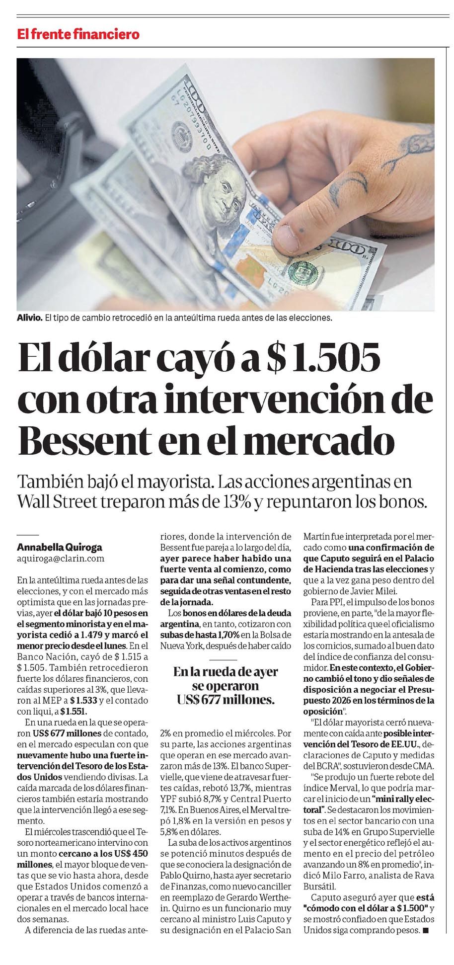 CLARÍN – El dólar cayó a $ 1.505 con otra intervención de Bessent en el mercado