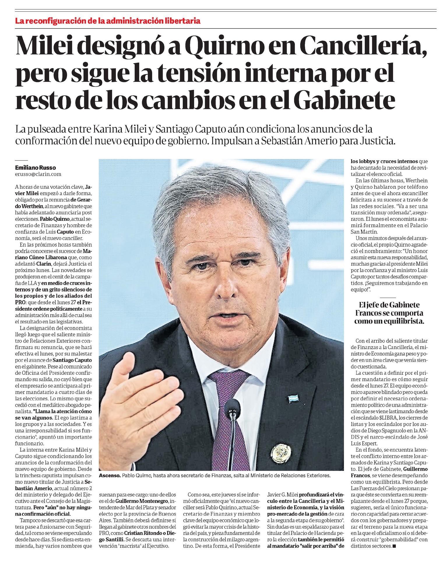 La pulseada entre Karina Milei y Santiago Caputo aún condiciona los anuncios de la conformación del nuevo equipo de gobierno. Impulsan a Sebastián Amerio para Justicia.