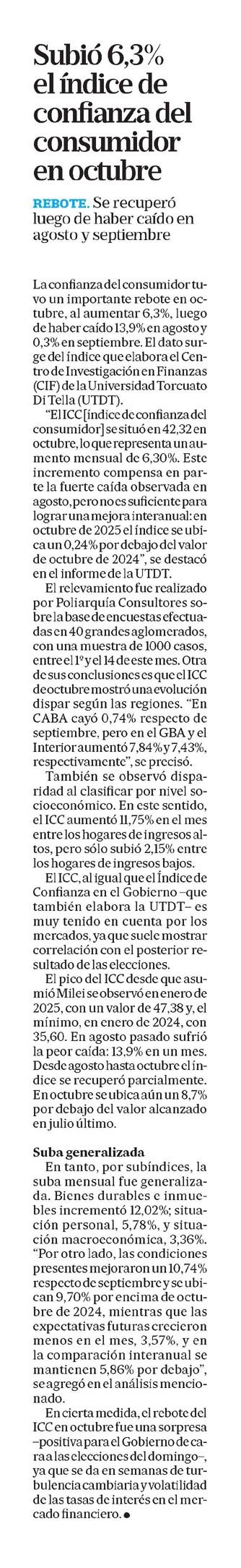 REBOTE. Se recuperó luego de haber caído en agosto y septiembre. La confianza del consumidor tuvo un importante rebote en octubre, al aumentar 6,3%, luego de haber caído 13,9% en agosto y 0,3% en septiembre. El dato surge del índice que elabora el Centro de Investigación en Finanzas (CIF) de la Universidad Torcuato Di Tella (UTDT).